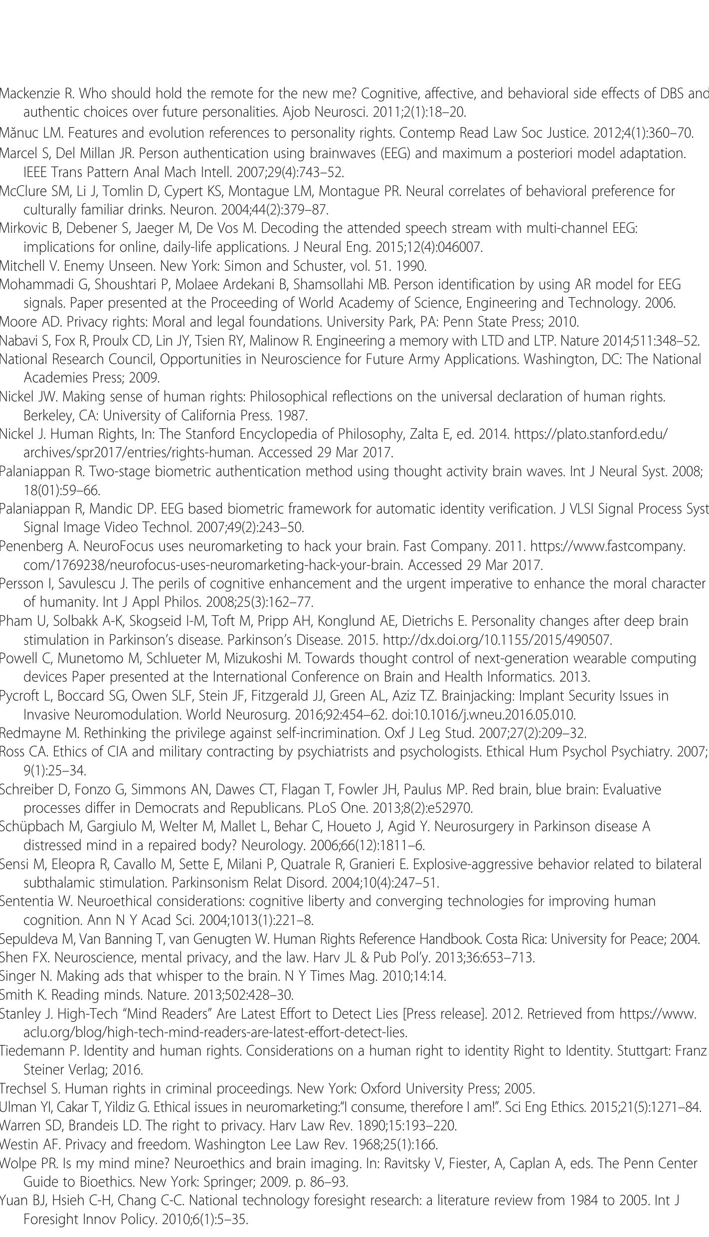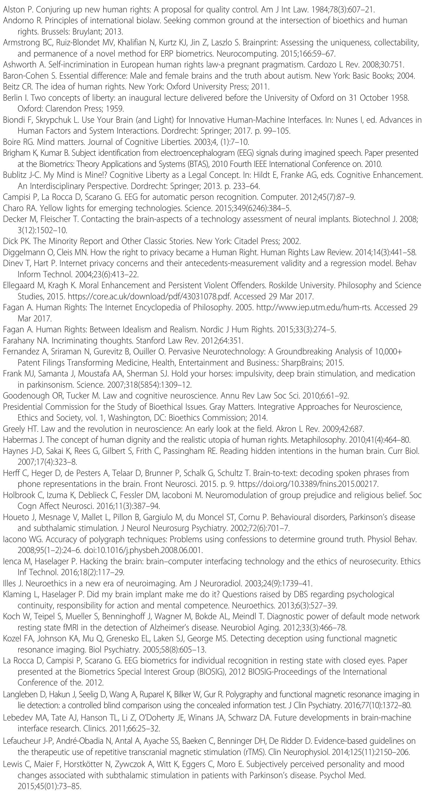 trabajo evalúa las implicaciones de los diferentes usos de las neurotecnologías en relación a los derechos humanos y sugiere que el marco actual de derechos humanos puede no ser suficiente para responder a estos desafíos emergentes. Después de analizar la relación entre neurociencia y derechos humanos, identificamos cuatro nuevos derechos que pueden ser de gran relevancia en las próximas décadas: el derecho a la libertad cognitiva, el derecho a la privacidad mental, el derecho a la integridad mental y el derecho a la continuidad psicológica.
